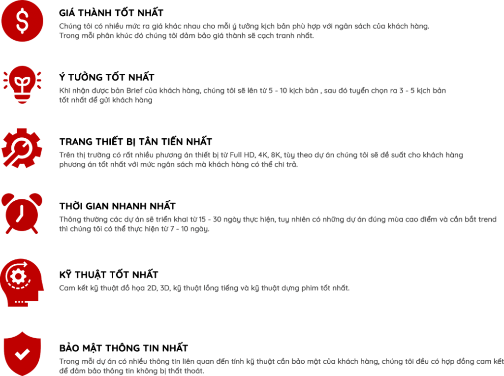 Chúng tôi cung cấp giải pháp tổng thể về Video quảng cáo từ việc xây dựng chiến lược, ý tưởng, quay phim tiền kỳ, dựng hậu kỳ video và cuối cùng là phát hành video quảng cáo hiệu quả tối ưu nhất cho khách hàng.